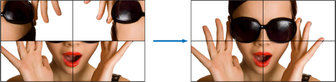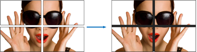 所有拼接顯示單元都有一定物理邊框縫隙,在無邊緣屏蔽功能處理情況下,圖像會(huì)出現(xiàn)視覺上拉扯開的現(xiàn)象,感覺很不自然;經(jīng)過邊緣屏蔽處理的圖像無變形、拉伸,視覺更自然逼真。如下圖邊緣屏蔽處理前后對(duì)比圖片: