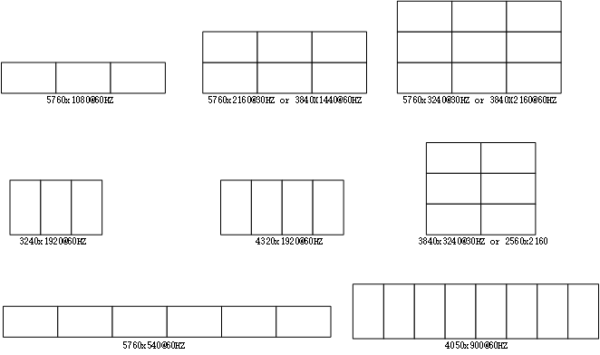 支持1路HDMI1.4信號(hào)、1路DP1.2輸入,HDMI信號(hào)最高只支持3840x2160@30Hz輸入。根據(jù)不同的拼接模式,DP輸入可選擇多種不同的分辨率輸入實(shí)現(xiàn)點(diǎn)對(duì)點(diǎn)拼接,如橫屏1x3模式5760x1080@60Hz、豎屏1x3模式3240x1920@60Hz、橫屏3x3模式5760x3240@30Hz。某些特殊拼接模式也可以實(shí)現(xiàn)自定義分辨率實(shí)現(xiàn)等比例、不變形、不拉伸顯示,如下:
