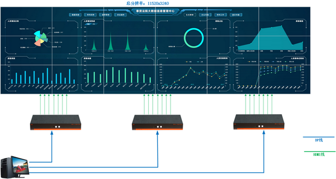 通過多臺(tái)MK-P系列配合多電腦多頭顯卡使用,組建成一套具有超高分辨率的拼接墻,如下3x6拼接墻通過3臺(tái)MK-P6組實(shí)現(xiàn)11520x3240的超大分辨率顯示: